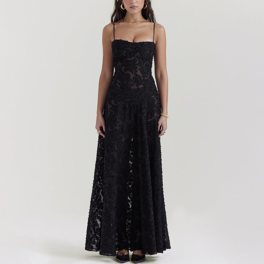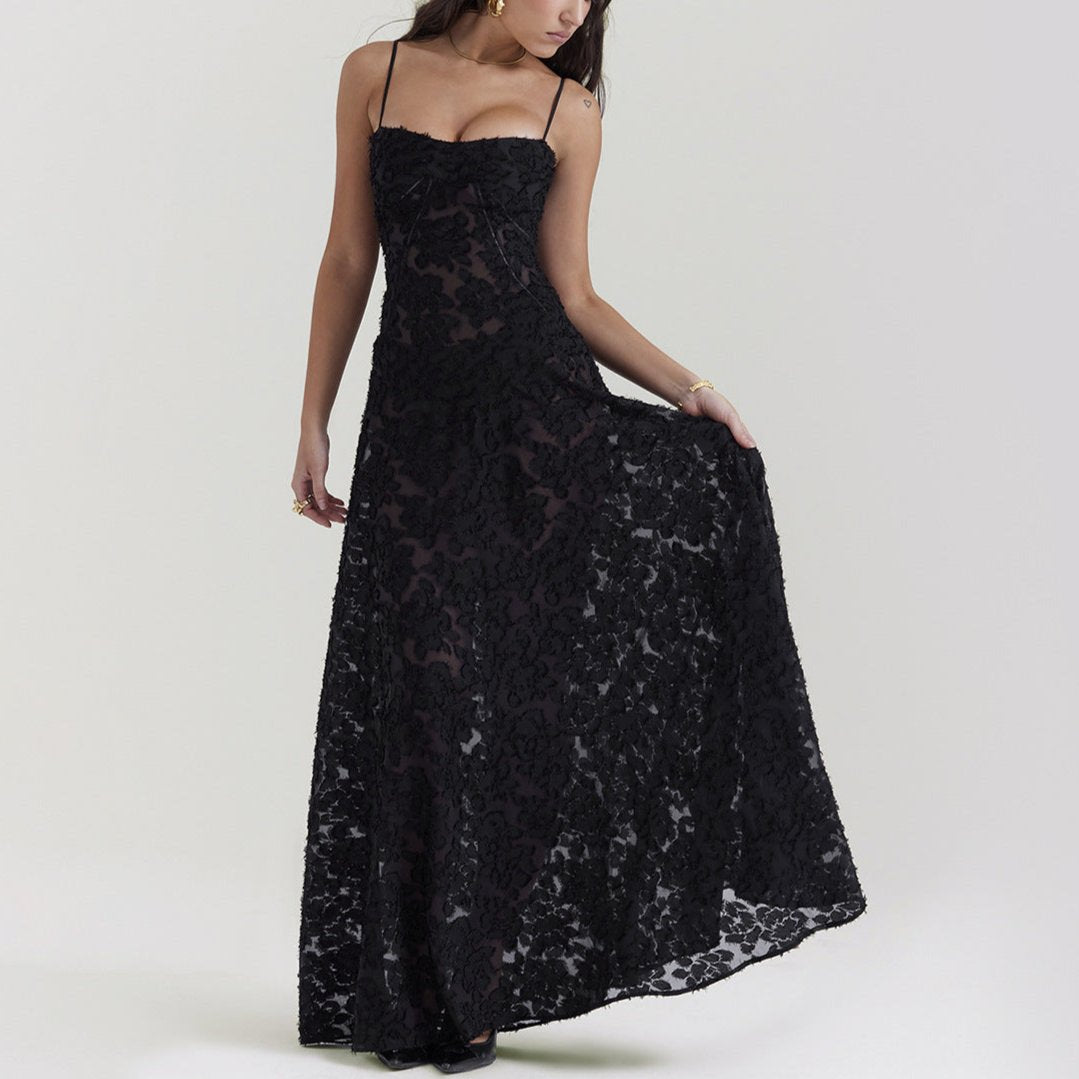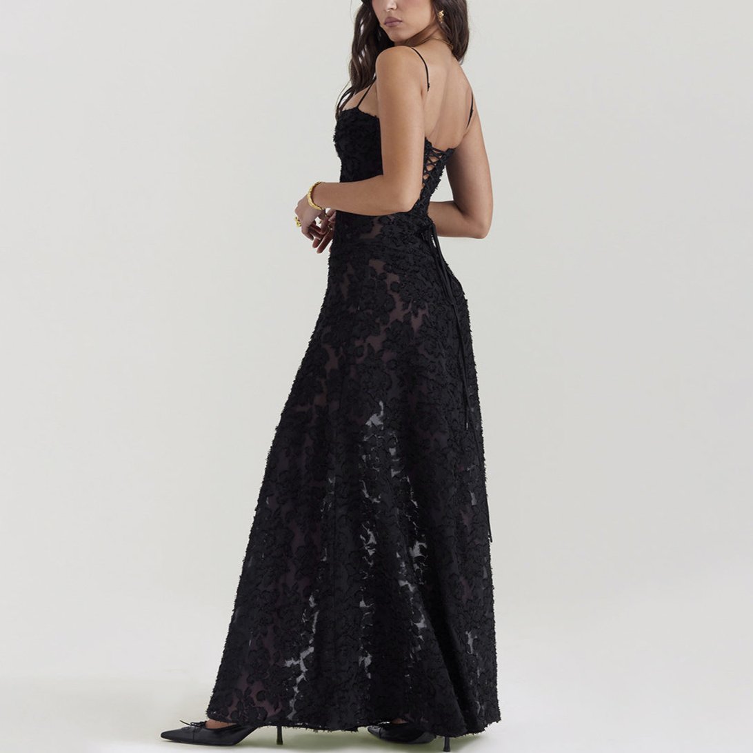 Embrace sophisticated allure with our Suspender Lace-Up Back Maxi Dress. This stunning black dress features a high-waisted, A-line silhouette that flatters all body types while flowing gracefully to the floor. Made from luxurious ice linen fabric with a soft polyester blend, it offers a smooth, breathable feel that’s perfect for evening events. The delicate lace detailing adds a touch of romance, while the adjustable lace-up back provides a modern twist and custom fit. Whether it’s a formal event or a stylish night out, this dress combines timeless elegance with contemporary style.