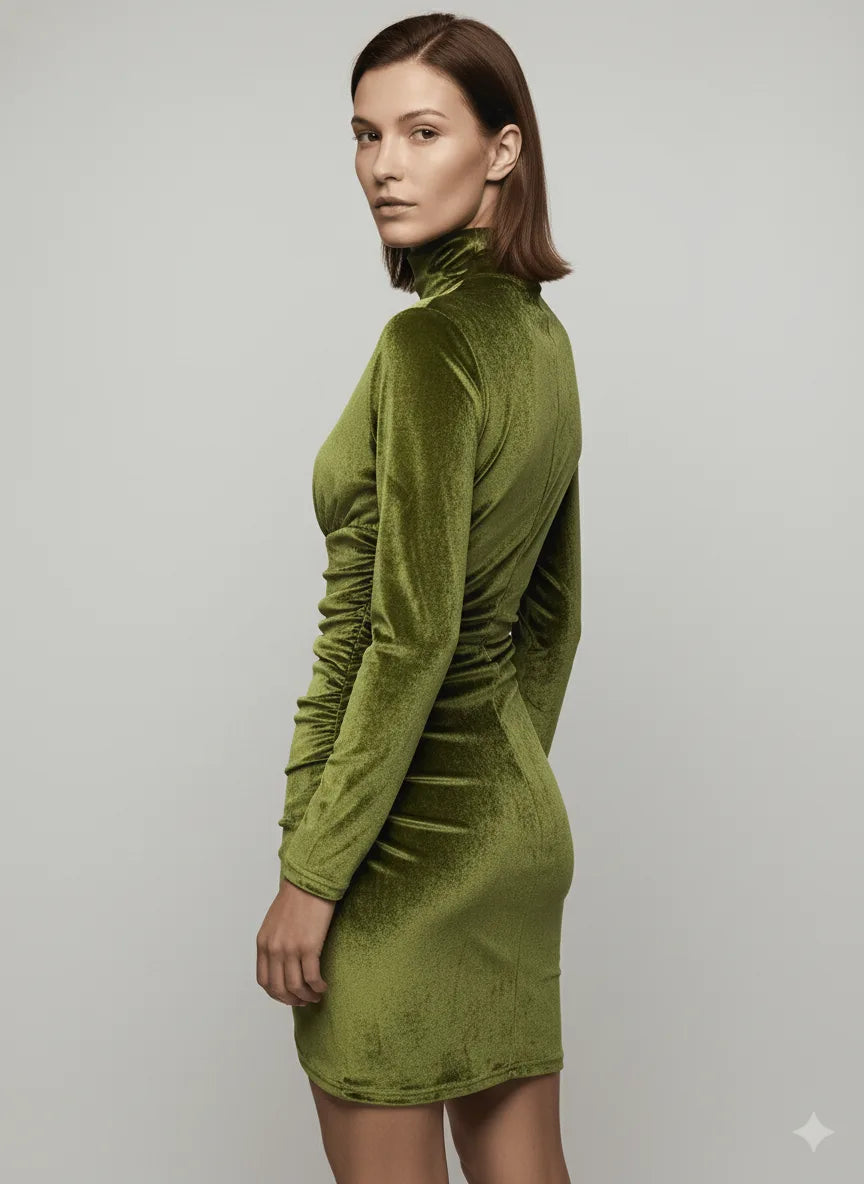 Wrap yourself in luxury with the High Neck Ruched Velvet Dress. Designed for the festive season, this piece combines the plush warmth of velvet with a figure-sculpting silhouette. It is the ultimate "throw-on-and-go" outfit for Christmas parties, winter weddings, and evening cocktails.