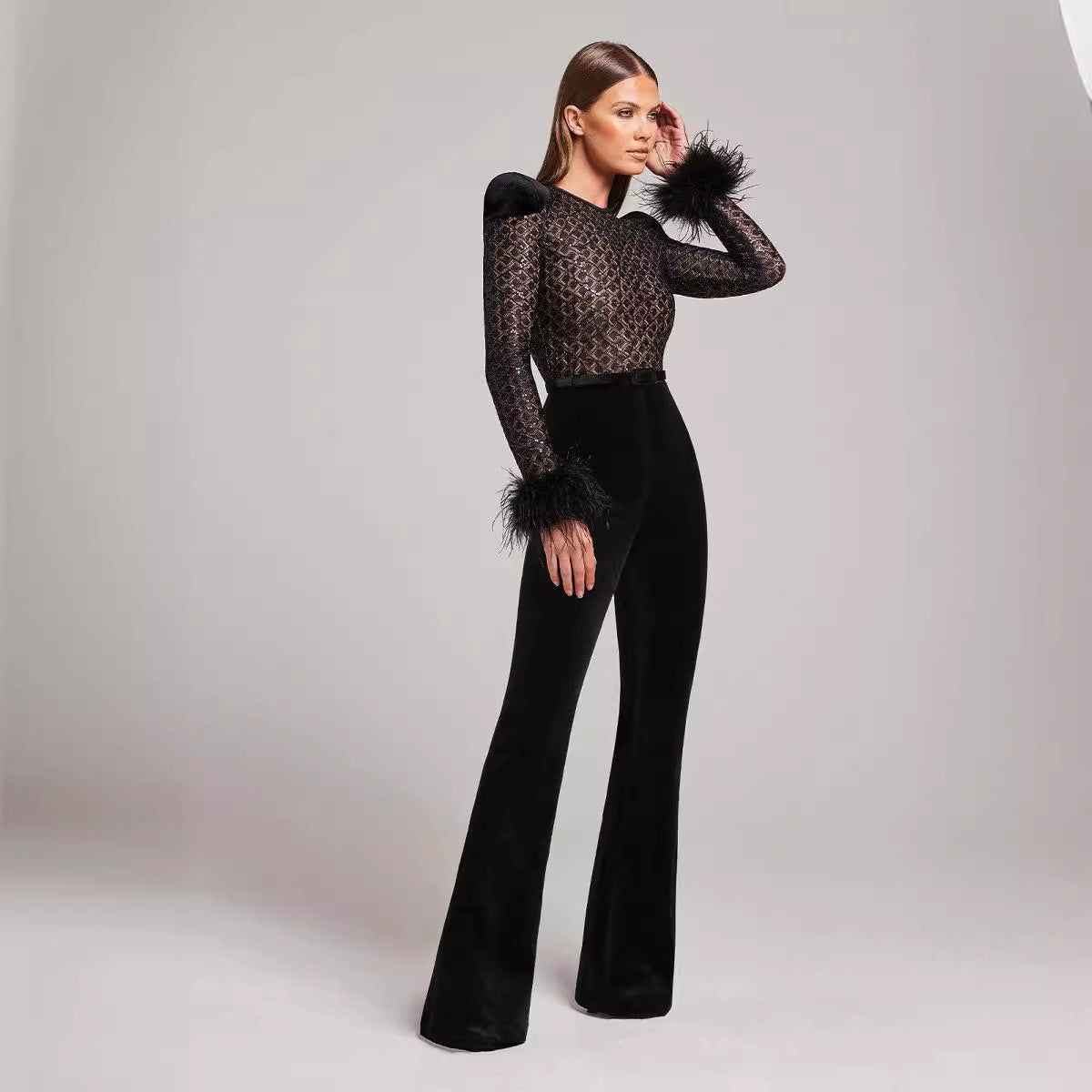 Elevate your wardrobe with the statement-making Lace Feather Sequins Bandage Jumpsuit and embody timeless sophistication!